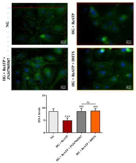 Immunocytochemistry evaluation of ZO-1 staining in endothelial cells subjected to normal or high glucose conditions + BzATP, in the absence or in the presence of JNJ47965567 or DHTS, for 48 h. ZO-1 was labeled with FITC (green) while nuclei were labeled with DAPI (blue). Images for ZO-1 immunostaining were acquired at 40× magnification. Scale bar: 10 µm. NG = normal glucose condition (5 mM). HG = high glucose condition (40 mM). BzATP = 200 µM. JNJ47965567 = 100 nM. DHTS = 500 nM. The average intensity (AU) of the data from more than 30 cells per coverslip for ZO-1 under our experimental conditions are shown. Values are reported as means ± SD of three independent experiments. Statistical analysis was performed using one-way ANOVA with Tukey’s post-hoc analysis. *** p < 0.001 vs. NG. ### p < 0.001 vs. HG + BzATP. ns = not significant.
