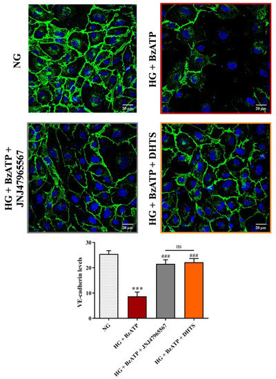 A similar trend was observed for expression of the adherens junction VE-cadherin. Figure 5 shows a significant reduction of VE-cadherin staining at the cell-cell contacts following the exposure to the HG/BzATP insult, as compared to cells grown in NG conditions. On the other hand, an increased expression of VE-cadherin was observed at an endothelial cell-cell interface after the pre-treatment with JNJ47965567 or DHTS compounds (Figure 5).