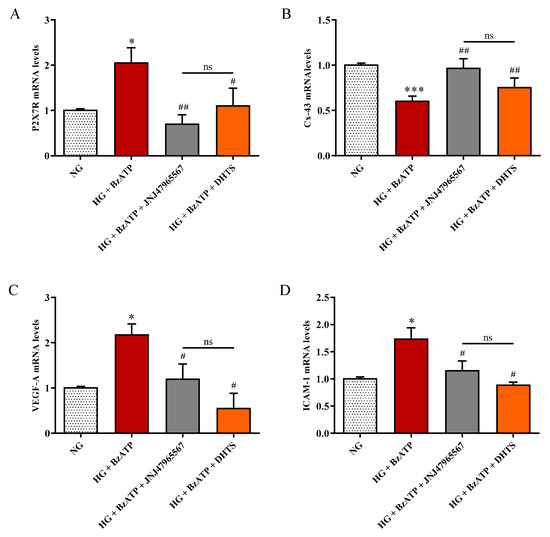 Measurement of (A) P2X7R, (B) Cx-43, (C) VEGF-A, and (D) ICAM-1 mRNA expression levels (qRT-PCR) in endothelial cells under our experimental conditions. NG = normal glucose condition (5 mM). HG = high glucose condition (40 mM). BzATP = 200 µM. JNJ47965567 = 100 nM. DHTS = 500 nM. The abundance of each mRNA of interest was expressed relatively to the abundance of 18S rRNA, as an internal control. Values are means ± SD of three independent experiments. * p < 0.05 vs. NG. *** p < 0.001 vs. NG. ## p < 0.01 vs. HG + BzATP. # p < 0.05 vs. HG + BzATP. ns = not significant.