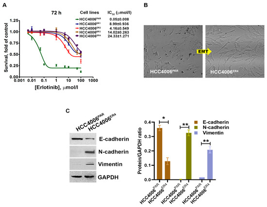 Cancer stem cells (CSCs), which are the outcome of epithelial–mesenchymal transition (EMT) and the hallmark of aggressive phenotypes, have been reported to promote drug resistance [27]. Thus, we investigated the cancer stemness by determining the morphology and some EMT markers. We observed extensive morphological changes in the resistant cells as compared to parental cells. These included loss of intracellular connections and loss of polarity, which are the critical features of mesenchymal cells (Figure 1B). Further, the evaluation of EMT markers in resistant and parental cells using Western blotting showed that erlotinib-sensitive cells exhibit increased E-cadherin expression, which is an epithelial cell marker. In contrast, HCC4006ER4 showed increased N-cadherin expression and vimentin expression, which are common mesenchymal cell markers (Figure 1C). This result indicates that erlotinib-resistant cells, HCC4006ER4 display mesenchymal cells’ properties, both phenotypically and by expression of mesenchymal cell-specific proteins.
