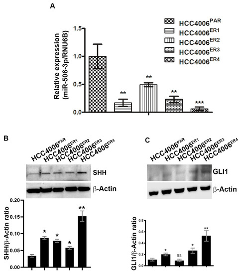 Downregulation of miR-506-3p and upregulation of its target Sonic Hedgehog (SHH) and glioma-associated oncogene homolog zinc finger protein 1 (GLI1) expression. (A) The bar graph indicates the quantitative relative expression of miR-506-3p in erlotinib-sensitive cells (HCC4006PAR) and erlotinib-resistant cells (HCC4006ER1, ER3 and ER4) by real-time PCR. Data are expressed as the mean ± SD, ** p < 0.005, *** p < 0.001 when compared to HCC4006PAR. (B) Western blot analysis and quantification (bar graph) of SHH protein erlotinib sensitive and resistant cells. β-actin is used as a loading control. Data show the mean ± SD and are representative of at least three independent experiments. * p < 0.01, ** p < 0.003 when compared to HCC4006PAR. (C) Detection and quantification (bar graph) of GLI1 protein level in sensitive and resistant cells using Western blot analysis. β-actin is used as a loading control. Data are expressed as the mean ± SD ns, non-significant and * p < 0.01, ** p < 0.007 when compared to HCC4006PAR.
