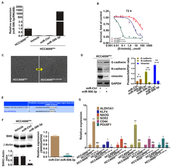 We investigated the implication of overexpression of miR-506-3p in erlotinib-resistant cells (which has low miR-506-3p expression). Erlotinib-resistant cells, HCC4006ER4,were transfected with pCMV-miR-506-3p vector or empty vector without the miR-506-3p gene (purchased from Origene, USA; cat. no. SC400433), and the expression level of miR-506-3p was quantified by qRT-PCR (Figure 4A). The resultant miR-506-3p-overexpressing cells, HCC4006ER4-miR-506-3pOE, were used to evaluate the sensitivity to erlotinib by crystal violet assay compared with HCC4006ER4-miRNA control (HCC4006ER4-miR-Ctrl). HCC4006ER4-miR-506-3pOE cells showed increased erlotinib sensitivity and diminished survival compared to control (Figure 4B). Microscopic examination of these cells showed HCC4006ER4 cells with a mesenchymal-like phenotype, whereas HCC4006ER4-miR-506-3pOE cells displayed an epithelial-like phenotype, demonstrating MET (Figure 4C). We then investigated the EMT markers in miR-506-3p-overexpressing cells. We found that E-cadherin expression was significantly increased, whereas vimentin and N-cadherin expression was decreased in HCC4006ER4-miR-506-3pOE cells compared to HCC4006ER4-miR-Ctrl cells (Figure 4D). In an effort to identify the putative target of miR-506-3p, we used TargetScan software (TargetScan 7.2 to predict its complementary binding targets. Interestingly, we found that SHH is one of the predicted targets of miR-506-3p (Figure 4E). We also showed that overexpression of miR-506-3p in erlotinib-resistant cells resulted in the downregulation of SHH protein and mRNA level (Figure 4F). Next, we studied the stemness of HCC4006PAR cells, erlotinib-resistant cells (HCC4006ER4), and HCC4006ER4-miR-506-3pOE. Total RNA was extracted from cells, and relative quantification of specific stem cell markers, ALDH1A1, KLF4, Nanog, SOX2, CD44, and POU5F1, were evaluated by qRT-PCR (Figure 4G). Overexpression of miR-506-3p resulted in the reversal of stem cell markers to a comparable level of HCC4006PAR. Taken together, these findings suggest that overexpression of miR-506-3p re-sensitizes erlotinib-resistant cells to erlotinib reprograms MET, downregulates expression of SHH protein, and stemness, all of which are associated with reduced growth and metastatic potential.