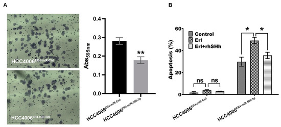 Migration and apoptotic activity of erlotinib-resistant cells and miR-506-3p-overexpressing erlotinib-resistant cells. (A) The migratory potential of HCC4006ER4-miR-Ctrl and HCC4006ER4-miR-506-3pOE cells was determined by the transwell migration assay. The photomicrographs represent the difference in the in vitro migration of HCC4006ER4-miR-Ctrl and HCC4006ER4-miR-506-3pOE cells toward the serum for 24 h (Magnification, 10×). Histogram showing crystal violet absorbance at 595 nm. Values in the bar graphs represent the mean ± SD (n = 6). ** p < 0.001 compared to HCC4006ER-miR-Ctrl cells. (B) Overexpression of miR-506-3p vectors in HCC4006ER4 cells promoted apoptosis after exposure to erlotinib which is counteracted by treatment with both erlotinib and rhSHH protein. Data are expressed as the mean ± SD, ** p < 0.001.