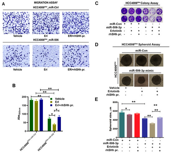 We demonstrated that miR-506-3p underexpression is associated with increased expression of SHH (Figure 3B) and is associated with increased invasiveness and EMT phenotype of lung cancer cells through the induction of the SHH signaling pathway. Moreover, ectopic expression of miR-506-3p in erlotinib-resistant cells inhibits SHH signaling. We further examined the effects of SHH ligand on miR-506-3p overexpressed cells and its response to erlotinib. HCC004ER4-miR-Ctrl and HCC4006ER4-miR-506-3pOE cells were treated with erlotinib and rhSHH. The migratory potential of treated and untreated cells was evaluated using Boyden migration chamber assays. HCC004ER4-miR-Ctrl showed a similar rate of migration in the presence of either erlotinib or erlotinib and rhSHH protein (Figure 6A, upper panels, and Figure 6B, first three bars). However, HCC4006ER4-miR-506-3pOE cells showed reduced migration in the presence of erlotinib (Figure 6A, lower panels, and Figure 6B, fifth bar). The reduced migration of erlotinib-treated cells was reversed when pretreated with rhSHH protein (Figure 6A, lower panels, and Figure 6B, sixth bar). Next, we studied the colony formation ability of these cells, and it was decreased in HCC4006ER4-miR-506-3pOE cells in the presence of erlotinib. However, this effect was reversed when the SHH ligand, rhSHH, was added (Figure 6C). We then conducted a spheroid assay to measure the self-renewal and multipotent nature of HCC004ER4-miR-Ctrl HCC4006ER4-miR-506-3pOE cells in the presence of only erlotinib and both erlotinib and rhSHH protein. Single-cell suspensions from pretreated cells were re-suspended at a density of 500 cells/mL mammocult media in a 96-well spheroid microplate. The size of the spheroids was monitored and recorded on alternate days for 8–10 days. There was no significant change in the spheroid size of HCC004ER4-miR-Ctrl cells in the presence of erlotinib and in the combination of erlotinib and rhSHH protein (Figure 6D,E). Treatment of HCC4006ER4-miR-506-3pOE cells with erlotinib resulted in a smaller spheroid (26.2% inhibition, p < 0.0001), which was effectively reversed when both erlotinib and rhSHH protein was used (Figure 6D,E). These findings, taken together, suggest that SHH ligand (rhSHH protein) can effectively reverse the effects of miR-506-3p overexpression-induced erlotinib sensitivity.
