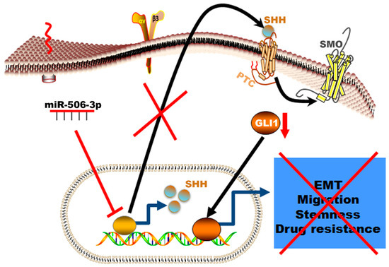 Recently, miRNAs have been investigated as potential biomarkers for diagnosis and predictors of prognosis for NSCLC [6]. Prognostic value of specific miRNAs has been reported, with most focus on miRNA present in the small extracellular vesicles (sEVs), frequently referred to as exosomes in plasma and serum [7]. sEVs can activate signaling pathways or deliver nucleic acids to distant cells. Among these miRNAs, miR-506 has been shown to play a crucial role in various cancers, including lung cancer [8,9,10,11,12,13,14,15]. miR-506 is involved in cell proliferation, differentiation, migration, and invasion [16]. It can act as a tumor suppressor gene in malignant bronchial epithelial cells, and restoration of miR-506 can suppress tumor growth in vitro and in vivo [17]. Additional research also showed that miR-506 prevented TGFβ-induced EMT, increased E-cadherin expression, and inhibited migration and invasion by targeting SNAIL family zinc finger-2 [18]. The Sonic Hedgehog (SHH) pathway, which is involved in organogenesis and embryogenesis, is regulated by miRNAs [19,20]. Abnormal activation of the SHH pathway can lead to the genesis of an aggressive form of basal cell carcinoma called ‘Gorlin’s syndrome.’ The SHH pathway is also abnormally activated in medulloblastoma and breast cancer [21,22]. Dysregulation of the SHH pathway can lead to increased intracellular β-catenin and hence an increase in invasion and metastatic potential [23]. Recent studies have shown that the SHH pathway is upregulated in a subset of lung adenocarcinoma with EGFR mutation [24,25], and inhibition of the SHH pathway can also enhance the activity of EGFR inhibitor gefitinib in pancreatic cancer cells [26]. Inhibition of Hedgehog signaling has been reported to sensitize NSCLC cells to EGFR-TKIs [20].