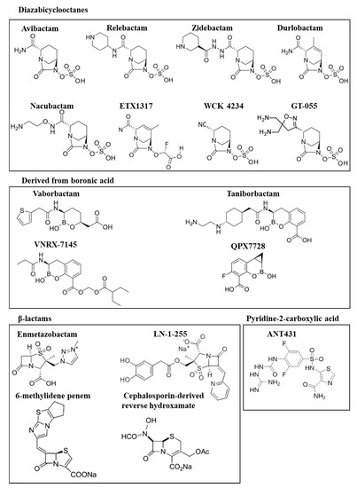 This review focuses on the recent studies of new carbapenemase inhibitors, recently approved for clinical use, or at preclinical or clinical stages of development (Figure 1). We consider those compounds capable of exhibiting high activity against the most widely distributed class A, B and D carbapenemases, with particular interest in boronic acid and DBO derivatives, two groups of new inhibitors that will be of key importance over the next decade in the development of inhibitors that will clear the way for the use of carbapenems.