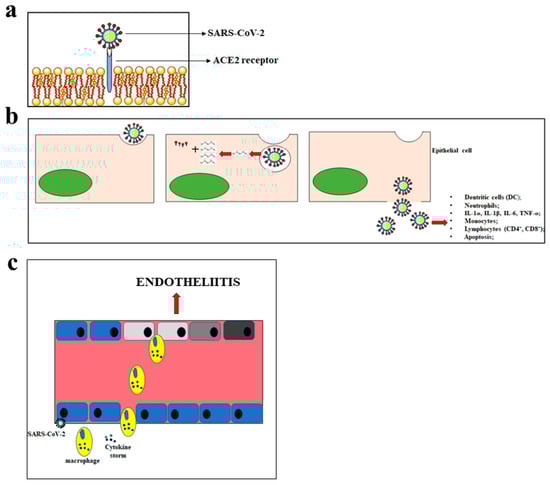 Main consequences of the SARS-CoV-2 penetration. In panel (a), the mechanism of SARS-CoV-2 penetration into the cells is represented. Panel (b) shows the massive inflammatory response following the cellular introduction of SARS-CoV-2. In panel (c), inflammation of the endothelium and the endotheliitis process are shown.