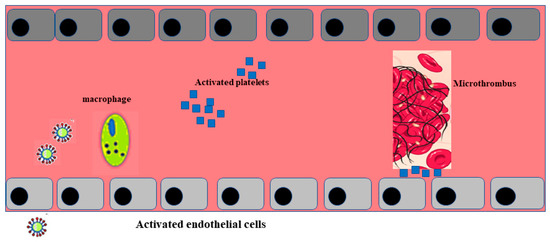 Post mortem examination of 21 people diagnosed with SARS-CoV-2 has shown that the primary cause of death was respiratory failure with massive capillary congestion and severe changes of rheological properties in capillaries. Nevertheless, subsequent findings have highlighted pulmonary embolisms (in four patients), alveolar haemorrhage (in three patients), thrombotic microangiopathy (in three patients), and vasculitis (in one patient). The observation of all patients also highlighted damage of the endothelial in the kidneys and intestines, suggesting vascular dysfunction in disease progression [90]. Another important study, carried out with an autoptic examination of 26 people who died as a consequence of SARS-CoV-2 infection, demonstrated kidney injuries with glomerular and vascular changes, occlusion of the microvascular lumens, and numerous erythrocytes as a consequence of endothelial damage [91]. The damage to the endothelium and the formation of a microthrombus, caused by SARS-CoV-2 infection, are represented in Figure 2.