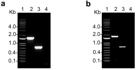 PCR confirmation of TcMICU1-KO and TcMICU2-KO. (a) TcMICU1-KO mutant was generated by CRISPR/Cas9-induced homologous recombination. A double-stranded gDNA break was produced by Cas9 at nt +70 of the TcMICU1 ORF (1221 bp). DNA was repaired with a blasticidin-S deaminase (Bsd) cassette containing 100-bp homologous regions from TcMICU1 5′ and 3′ untranslated regions (UTRs). The gene replacement was verified by PCR. The intact locus generates a PCR product of 1544 bp, while the disrupted locus generates a fragment of 722 bp. (b) TcMICU2-KO mutant was generated by CRISPR/Cas9-induced homologous recombination. A double-stranded gDNA break was produced by Cas9 at nt +84 of the TcMICU2 ORF (1407 bp). DNA was repaired with a blasticidin-S deaminase (Bsd) cassette containing 100-bp homologous regions from TcMICU2 5′ and 3′ untranslated regions (UTRs). The gene replacement was verified by PCR. The intact locus generates a PCR product of 1701 bp, while the disrupted locus generates a fragment of 693 bp. Lanes: 1, 1-kb ladder; 2, wild type; 3, TcMICU1-KO (a) or TcMICU2-KO (b); 4, PCR negative controls.
