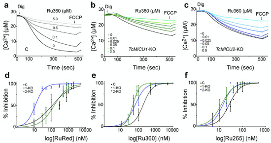 As is shown in Figure 2a, extramitochondrial Ca2+ was sequestered in the mitochondria of control cells and released by the uncoupler FCCP. In agreement with a previous report [20], both TcMICU1-KO and TcMICU2-KO epimastigotes showed a reduced capacity for mitochondrial Ca2+ uptake (Figure 2b,c). This activity was inhibited by Ru360, added prior to the delivery of 30 µM Ca2+ in the presence of succinate as an energy source, in a dose-dependent manner, and with an IC50 of 185.9 ± 15.2 nM. As shown in Figure 2e, a sigmoidal fit is displayed for this inhibition. RuRed (Figure 2d) and Ru265 (Figure 2f) also inhibited mitochondrial Ca2+ uptake in a dose-dependent mode with IC50s of 117 ± 16.9 nM and 26.3 ± 2.0 nM, respectively.