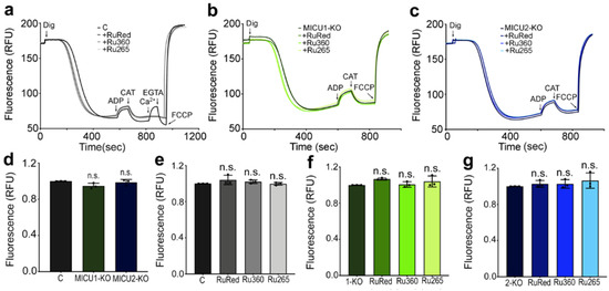 Figure 3a–c show that the addition of ADP to these preparations caused a small decrease in the Δψm that returned to its normal level when the adenine nucleotide translocator (ANT) inhibitor carboxyatractyloside was added to inhibit ADP/ATP exchange, while the addition of FCCP collapsed Δψm. The presence of either RuRed, Ru360 or Ru265 did not significantly affect the Δψm of control, TcMICU1-KO or TcMICU2-KO (Figure 3d) cells, or their response to ADP (Figure 3e–g). Figure 3a shows that the addition of Ca2+ caused membrane depolarization in control cells that returned to basal levels after the addition of EGTA, but no changes were observed when ruthenium-derivatives were present.