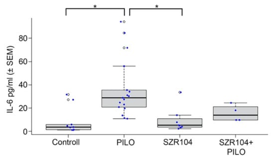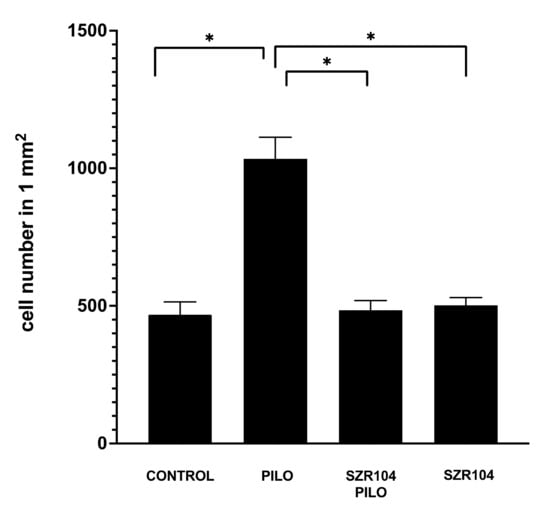 | SZR104 (358 mg/kg) and PILO (190 mg/kg) i.p. injections | 8 | Blood samples (4 animals). Immunohistochemistry (4 animals). |
