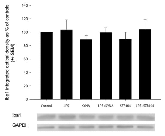 2.4. Effect of KYNA and SZR104 on Microglia Phagocytosis and Iba1 Immunoreactivity