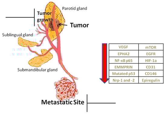 (ix) Epiregulin, an EGFR ligand, was found overexpressed in ACC cases compared to NSG, as well in the ACC cell line showing high lung metastasis incidence compared to the parental ACC cell line. Researchers also showed that high levels of epiregulin promoted the production of angiogenic factors such as VEGF both in ACC cell lines and in ACC tissue specimens, as well as in human pulmonary microvascular endothelial cells (HPMECs), concluding that epiregulin enhances angiogenesis in the primary tumor microenvironment and vascular permeability in the pre-metastatic lung microenvironment. Finally, they established significant correlations between high epiregulin expression and primary tumor size and stage, local recurrence, lung metastasis incidence, OS, and metastasis-free survival (MFS) [41].