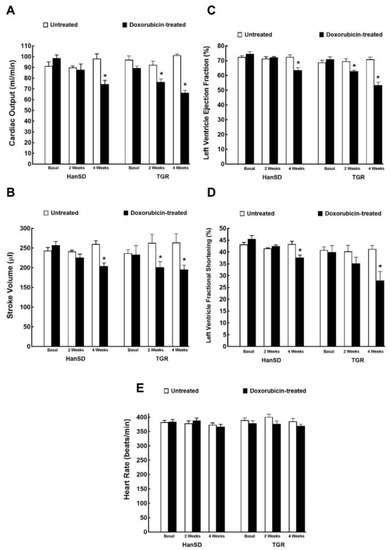 Assessment of the cardiac functional parameters by echocardiography before administration of doxorubicin (basal values), at the end of doxorubicin administration (2 weeks values) and two weeks after termination of doxorubicin treatment (4 weeks values) in normotensive, transgene-negative Hannover Sprague-Dawley (HanSD) and hypertensive, Ren-2 transgenic (TGR) rats. Cardiac output (A), stroke volume (B), left ventricle ejection fraction (C), left ventricle fraction shortening (D), heart rate (E). * p < 0.05 compared with untreated animals of the same strain at the same time point. The values are means ± SEM.