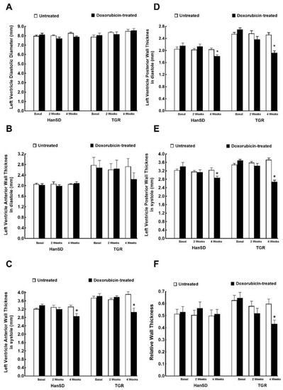 Assessment of the cardiac morphological parameters by echocardiography before administration of doxorubicin (basal values), at the end of doxorubicin administration (2 weeks values) and two weeks after termination of doxorubicin treatment (4 weeks values) in normotensive, transgene-negative Hannover Sprague-Dawley (HanSD) and hypertensive, Ren-2 transgenic (TGR) rats. Left ventricle diastolic diameter (A), left ventricle anterior wall thickness in diastole (B), left ventricle anterior wall thickness in systole (C), left ventricle posterior wall thickness in diastole (D), left ventricle anterior wall thickness in (E), relative wall thickness (F). * p < 0.05 compared with untreated animals of the same strain at the same time point. The values are means ± SEM.