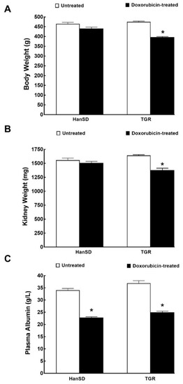 As shown in Figure 3A,B, DOX did not cause significant decreases in body weight and kidney weight in HanSD rats, but did so in TGR. Moreover, DOX caused similar decreases in plasma albumin levels in HanSD rats and TGR (Figure 3C).