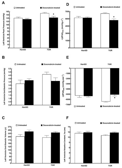 The first data part of the left ventricular cardiac function assessment by invasive hemodynamic analysis performed two weeks after the last doxorubicin injection (i.e., at the end of the experimental protocol) in normotensive, transgene-negative Hannover Sprague-Dawley (HanSD) and hypertensive, Ren-2 transgenic (TGR) rats. Left ventricle peak pressure (A), left ventricle end-diastolic pressure (B), left ventricle end-diastolic volume (C), maximum rates of pressure rise (+dP/dt)max (D), maximum rates of pressure fall (−dP/dt)max (E), relaxation constant tau (F). * p < 0.05 compared with untreated animals of the same strain. The values are means ± SEM.
