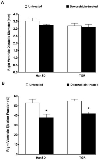 Right ventricle function. Assessment of the right ventricle diastolic diameter (A) and right ventricle ejection fraction (B) by echocardiography after the last doxorubicin injection (i.e., at the end of the experimental protocol) in normotensive, transgene-negative Hannover Sprague-Dawley (HanSD) and hypertensive, Ren-2 transgenic (TGR) rats. * p < 0.05 compared with untreated animals of the same strain. The values are means ± SEM.