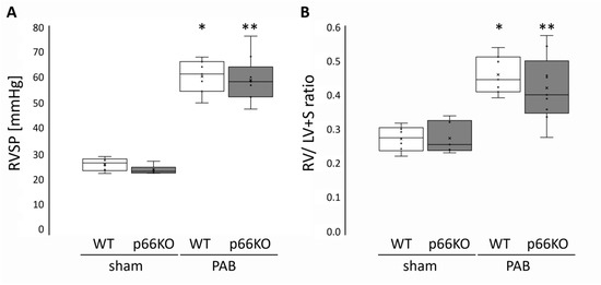 Right ventricular systolic pressure (RVSP) and hypertrophy in mice three weeks after pulmonary artery banding (PAB) or sham surgery. (A) RVSP (in mmHg) and (B) right ventricular weight normalized to the left ventricle and septum weight (RV/LV + S ratio). Data are given for wild type (WT) and p66shc knockout (p66KO) mice three weeks after sham surgery (n = 6 each group) and for WT and p66KO mice three weeks after PAB (n = 7 and n = 9, respectively). Data are expressed as 25%, 50%, and 75% quartiles with whiskers representing the total range. The dots represent the individual data points. *: p < 0.05 vs. WT sham and **: p < 0.05 vs. p66KO sham as analyzed by two-way ANOVA.