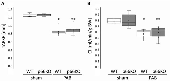 Tricuspid annular plane systolic excursion (TAPSE)—a commonly used parameter of RV function—as well as cardiac index (CI) were determined by echocardiography. Both parameters decreased similarly in WT and in p66KO mice three weeks after PAB compared to sham operated animals (Figure 3).