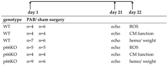 Analgesic buprenorphine hydrochloride (Temgesic®, 0.1 mg/kg, Sigma-Aldrich, Steinheim, Germany) was given subcutaneously 30 min prior to surgery. Anaesthesia was initiated by isoflurane 3–4% and maintained by isoflurane 1.5–2.5% supplemented with 100% oxygen. Afterwards, mice were intubated and mechanically ventilated using a mouse ventilator MiniVent type 845 (Hugo Sachs Elektronik, March-Hugstetten, Germany), while placed on a heating surface. After left anterolateral thoracotomy via the second intercostal space, a small titanium clip (Hemoclip®, Edward Weck & Co., Inc., Research Triangle Park, NC, USA) was placed around the pulmonary trunk with a specially modified hemoclip applier in order to produce a 65–70% constriction of the pulmonary artery. The chest and afterwards the skin were closed with 6.0 prolene sutures. Sham operated mice underwent the same procedure without applying the hemoclip. In total, 31 WT and 33 p66KO mice were subjected to surgery for this study. The design of the study is shown in Figure 4.