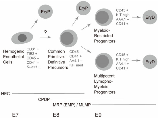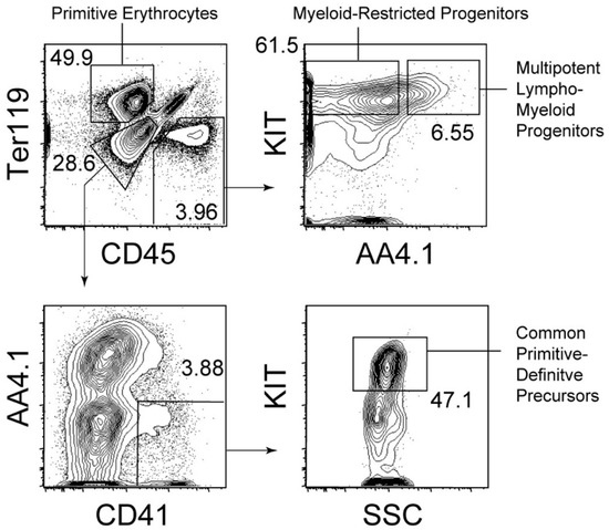 As mentioned above, primitive erythrocytes were thought to be separate cell types from other lympho-myeloid hematopoietic cell lineages. Some studies have suggested bipotential hematopoietic activity for primitive erythrocytes and multilineage hematopoiesis. Although these studies clearly showed that single cells could generate both primitive erythrocytes and multiple myeloid lineages, including adult-type erythrocytes, the developmental stages of cells showing bipotential capability were unclear [42]. However, recent studies have shown that a committed hematopoietic cell population serves as a common precursor for primitive erythrocytes and lympho-myeloid lineages. These earliest hematopoietic progenitors are found in the CD41+CD45− cell stage and lack endothelial potency [29]. Hence, these progenitors are committed hematopoietic cells. At the single-cell level, these cells can generate primitive erythrocytes and B progenitors that undergo gene rearrangements; therefore, these cells serve as common primitive-definitive precursors [29]. However, these cells still lack self-renewal capability [29]. These common precursors for primitive erythrocytes and lympho-myeloid lineages are abundantly present through the E8 to E9 yolk sac. Therefore, these cells seem to be a major source of primitive erythrocytes in the E8 to E9 yolk sac. However, the exact in vivo potency of these progenitors is not deciphered here as this study is based on ex vivo detection of globin mRNA and gene rearrangement [29,43]. However, further studies using in vivo tracking technologies without disrupting embryos may answer this question. Detailed cell surface marker expression and cell identification strategies used for the isolation of these progenitors are summarized in Figure 1.