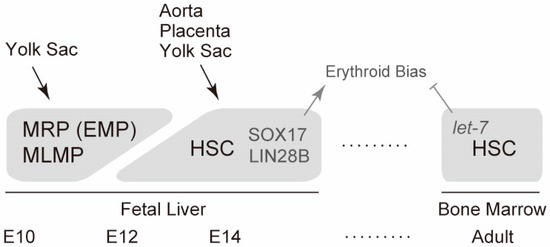 After the first wave of erythropoiesis and hematopoiesis, hematopoietic stem cells generated at multiple sites, including the aorta, placenta, and yolk sac, migrate into the fetal liver. Long-term repopulating hematopoietic stem cells appear in the fetal liver around E12 [49]. Hematopoietic stem cells at this stage are highly proliferative. The cells double daily until E14 [49]. Notably, fetal liver hematopoietic stem cells preferentially differentiate into erythroid cells compared with adult bone marrow hematopoietic stem cells [50,51]. Fetal liver microenvironments partly explain erythroid bias because abundant erythropoietin seems to be expressed at this stage [52].
