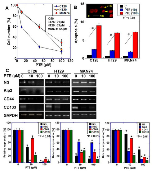 In our study, PTE induced strong ROS production in all three cancer cells. While low concentrations of ROS promote stemness and epithelial-mesenchymal transition in cancer cells [25,26], high concentrations induce apoptosis [27,28]. PTE has been suggested to induce high levels of ROS, leading to cell death, especially in cancer stem cells that show undifferentiated properties, but not in differentiated cells. This study has been conducted in order to prove the suppression of tumor cells by low concentration of PTE, such as supplements. The antitumor effect of even 10 μM of PTE suggests that the safe and effective therapeutic application of PTE is possible.