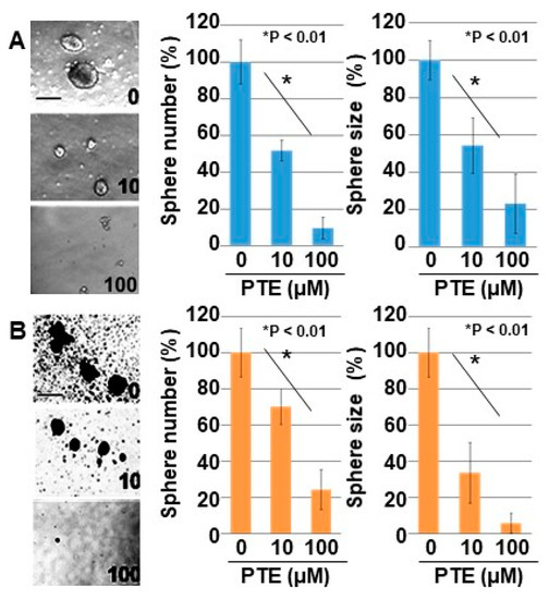 Cells (10,000 cells per well) were seeded on uncoated bacteriological 35-mm dish (Coning Inc., Coning, NY, USA) with 3D Tumorsphere Medium XF (Sigma). Cells were cultured with or without PTE (10, 50, 100 μM). After 7 days, sphere images were captured on a computer and the sphere size was measured using NIH ImageJ software (version 1.52, NIH, Bethesda, MD, USA). We counted the number of all spheres in the culture well. The sphere size designated was a mean of all spheres in the well.