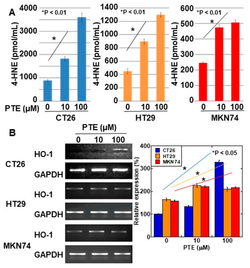 Intracellular levels of 4-hydroxynonenal (4-HNE) were determined for evaluating ROS generation by PTE treatment (Figure 3A). In all three cell lines, 4-HNE concentration increased in a PTE dose-dependent manner. Furthermore, we investigated the gene expression of heme oxygenase (HO)-1, which is known to be a rescue protein against oxidative stress [21,22] (Figure 3B). In CT26 cells, a high concentration of PTE (100 μM) induced heme oxygenase-1 (HO-1) expression; however, in HT29 and MKN74 cells, low- and high-concentrations of PTE (10 and 100 μM, respectively) induced HO-1 expression.