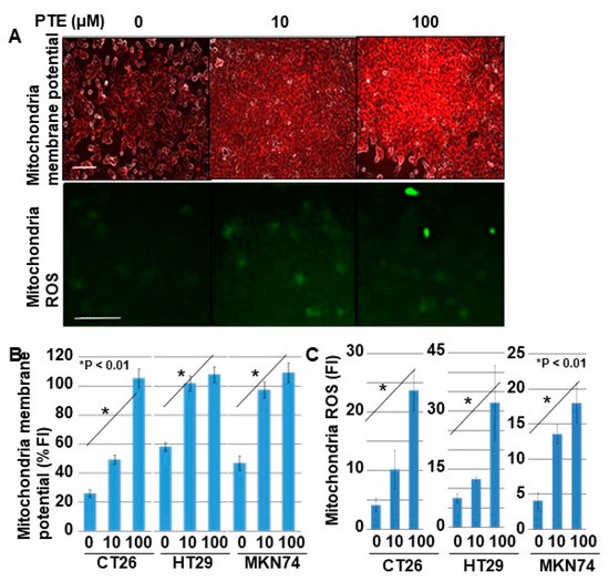 Next, we examined the effect of PTE on mitochondrial membrane potential and mitochondrial ROS generation (Figure 4). The mitochondrial membrane potential of all cell lines increased in a PTE-dose-dependent manner (Figure 4A,B). Furthermore, ROS derived from mitochondria also increased in a PTE-dose-dependent manner (Figure 4A,C).