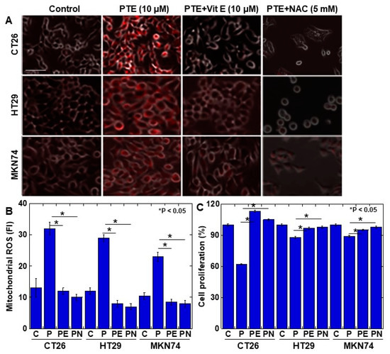 Finally, to examine whether PTE-induced ROS generation causes cytotoxicity, cells were treated with vitamin E or N-acetyl-L-cysteine (NAC) to suppress ROS generation (Figure 5). The generation of mitochondrial ROS was almost completely suppressed to the control levels by vitamin E and NAC (Figure 5A,B). The concurrent treatment with PTE and vitamin E or NAC showed that the PTE-mediated inhibition of cell proliferation was rescued by vitamin E and NAC (Figure 5C).