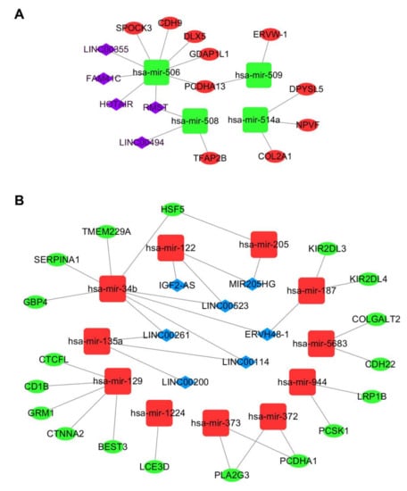 Metastasis-associated ceRNA network for colorectal cancer (CRC). (A) Green squares represent downregulated miRNAs, red ellipses represent upregulated mRNAs, and purple diamonds represent upregulated lncRNAs. (B) Red squares represent upregulated miRNAs, green ellipses represent downregulated mRNAs, and blue diamonds represent downregulated lncRNAs.
