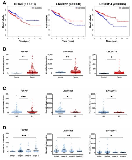 Clinical feature analysis of HOTAIR, LINC00261, and LINC00114. (A) Kaplan–Meier analysis of CRC overall survival according to the three lncRNAs. Percent survival is shown on the y-axis, and time is shown on the x-axis. Red lines represent patients with higher expression levels of lncRNAs, and blue lines represent patients with lower expression levels of lncRNAs (p < 0.05 log-rank test). (B) LncRNA expression analysis in CRC tissues and normal tissues. (C) LncRNA expression analysis in metastatic CRC tissues (M1) and nonmetastatic samples (M0). (D) LncRNA expression analysis in stages 1–4 of CRC. Significant differences were assessed by nonpaired t-tests. n.s., not significant; * p < 0.05, ** p < 0.01, *** p < 0.001.