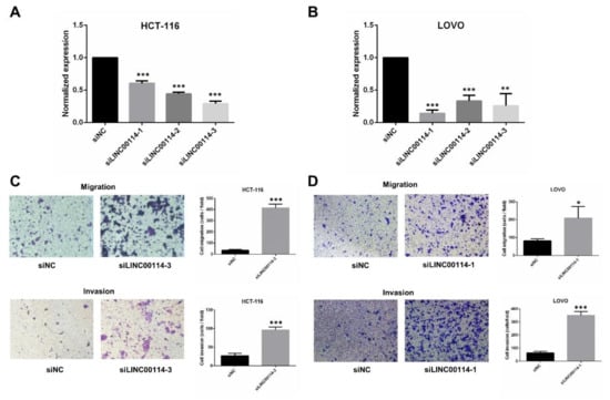LINC00114 represses CRC cell migration. (A,B) LINC00114 expression levels were determined in negative control or siRNA-transfected HCT-116 or LOVO cells by qRT-PCR. Expression levels were normalized to GAPDH, and the results were expressed as the fold increase relative to negative control. (C,D) Transwell assays were used to determine the role of LINC00114 siRNA in HCT-116 or LOVO cell migration and invasion. All data are expressed as mean ± standard deviation (SD) of three independent experiments; * p < 0.05, ** p < 0.01, *** p < 0.001.