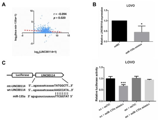LINC00114 is the direct target of miR-135a. (A) Pearson’s correlation analysis showed that miR-135a was negatively associated with LINC00114. (B) The levels of LINC00114 were determined in negative control or miR-135a-mimic-transfected LOVO cells by qPCR. (C) Schematic illustration shows the miR-135a binding site and the reverse complementary sequence mutations in LINC00114. Luciferase assay was used to identify the miR-135a binding site. All data are expressed as mean ± SD of three independent experiments; * p < 0.05, *** p < 0.001.