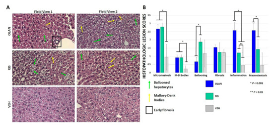 Moderate duration AA treatment induced microsteatosis, macrosteatosis, ballooning hepatocytes, inflammatory foci, and Mallory–Denk body formation in healthy mice, as shown across two representative field views in Figure 1A. Significant differences in histopathologic lesion scores between RIS or OLAN and VEH controls were found for microsteatosis, Mallory–Denk body formation, and formation of inflammatory foci (Figure 1B). Significant differences in hepatocyte ballooning and macrosteatosis were found for RIS and OLAN, respectively. There was early evidence of periportal fibrosis occurring sporadically in OLAN-treated mice, although this did not rise to statistical significance. Lesions generated by RIS and OLAN were largely consistent with early NAFLD.