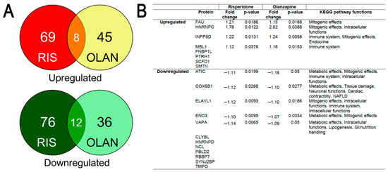 Proteomic analysis of hepatic proteins differentially expressed (DE) by both risperidone and olanzapine. (A) Venn diagrams showing shared proteins that are significantly upregulated (top) or downregulated (bottom) in risperidone (RIS)- or olanzapine (OLAN)-treated mice (p < 0.05). (B) Of the 20 shared proteins, 9 were found to have KEGG (Kyoto Encyclopedia of Genes and Genomes) pathway maps from which predicted functional changes could be determined. Statistical significance (p < 0.5) of differentially expressed (DE) proteins relative to vehicle (VEH). RIS n = 5; OLAN n = 4; VEH n = 4. Abbreviations: NAFLD, non-alcoholic fatty liver disease; GI, gastrointestinal.
