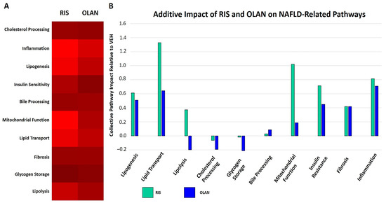Dysregulation of pathways leading to NAFLD during risperidone and olanzapine treatment. DE proteins measured in this study are integral parts of several pathways in the KEGG database known to contribute to NAFLD. The number of proteins altered in RIS- or OLAN-treated mice (relative to VEH-treated controls) in each pathway group were tabulated (A). The intensity of red (λ = 100–255 nm) reflects the number of proteins per pathway significantly different from VEH-treated mice during RIS treatment (left panel) and OLAN treatment (right panel). The aggregate changes in functionality of pathways across proteins compared to VEH-treated mice for RIS and OLAN are depicted (B). RIS and OLAN dysregulated inflammation, fibrosis, insulin resistance, and lipogenesis at comparable levels, but vary markedly in their impact on pathways related to lipolysis, lipid transport, glycogen storage, cholesterol processing, and mitochondrial function.