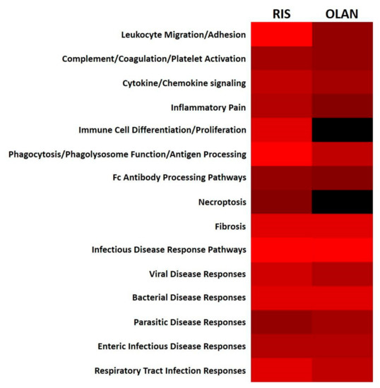 Dysregulation of immune function pathways during risperidone and olanzapine treatment. DE proteins measured in this study are integral parts of several immune function pathways in the KEGG database. The number of proteins altered in RIS- or OLAN-treated mice (relative to VEH-treated controls) in each pathway group were tabulated. The intensity of red (λ = 100–255 nm) reflects the number of proteins per pathway significantly different from VEH-treated mice during RIS treatment (left panel) and OLAN treatment (right panel). Absence of any altered proteins in a particular pathway is depicted in black (λ = 0 nm).