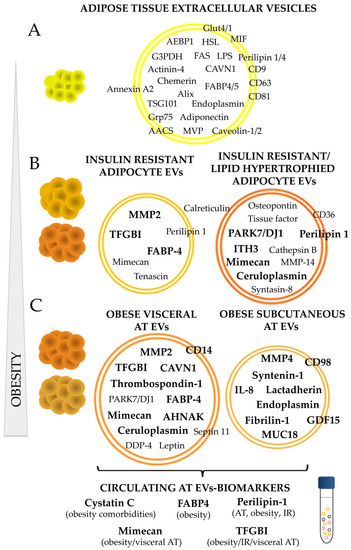 In this review, we tried to compile all the information up to date in relation to adipose tissue EVs specific protein content, and its variation under metabolic stress and/or in the context of obesity and its comorbidities. There are now several reports describing AT EVs-ARNs [62,63]; conversely, the description of EVs protein cargo, has not paralleled those studies. In this review we describe the protein content of EVs isolated from human and animal adipocytes in culture, from the stromal vascular fraction, and also from whole adipose tissue paying special attention to those proteins elevated during the development of obesity. We can conclude that adipose tissue reflects its metabolic status and deregulation through its secreted vesicles, which carry not only adipocyte cell makers including well known adipokines such as leptin or adiponectin, but also markers of malignancy. The investigations done so far have shown that obesity is characterized by a greater number of EVs secretion that it is paralleled at circulating level. Moreover, it can be affirmed that those adipocytes under metabolic insults (insulin resistant or lipid hypertrophied) or obese AT shed a greater number of EVs whose type and cargo depends on its anatomical origin. Thus, in relation to protein content, those vesicles secreted by visceral AT have shown a greater number of different and adipose-related proteins than subcutaneous; accordingly, those visceral vesicles carry a greater number of obese and comorbidities associated proteins. Importantly, in this review we draw attention to protein perilipin 1 as an AT derived-EVs specific protein that may allow to discern adipocyte specific vesicles among others at circulating level [15,48,56]. More interestingly, we compiled the most representative EVs proteins of pathological AT tissue that may represent good circulating biomarkers such as the perilipin itself, cystatin C, FABP-4, mimecan, and TFBI.