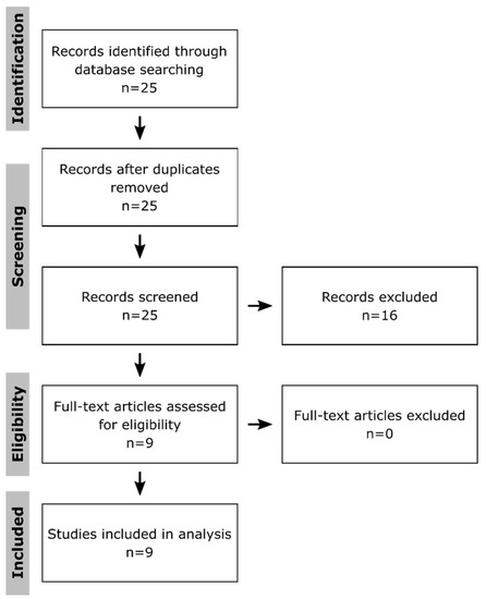 - Moher, D.; Liberati, A.; Tetzlaff, J.; Altman, D.G.; The PRISMA Group. Preferred Reporting Items for Systematic Reviews and Meta-Analyses: The PRISMA Statement. PLoS Med. 2009, 6, e1000097. [Google Scholar] [CrossRef]