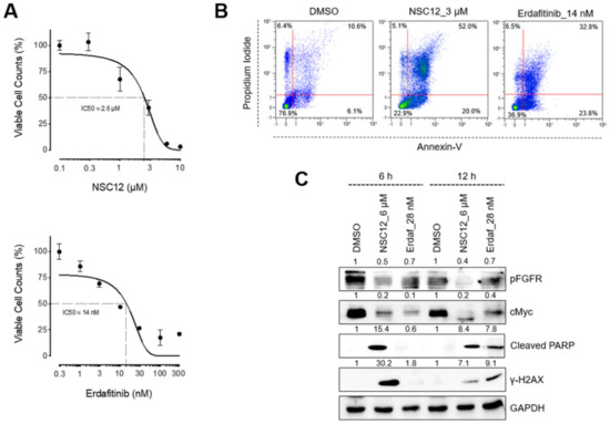 Downregulation of the levels of c-Myc protein has been described as a key mechanism in the therapeutic response to FGF/FGFR inhibitors [24]. We have recently demonstrated that the reduction of c-Myc levels induced by FGF/FGFR inhibition triggers DNA damage and oxidative-stress-mediated apoptosis in multiple myeloma cells [10,22]. Accordingly, inhibition of FGFR activation by NSC12 or erdafitinib was paralleled by a significant decrease of the levels of c-Myc and its target genes PRDX3, PRDX4, MCMC2 and EIF3B (Figure S1) and caused DNA damage in H1581 cells, as revealed by an increase of H2AX (γ-H2AX) protein phosphorylation and of cleaved PARP (Figure 1C). Together, these data suggest that inhibition of FGFR activation and down-modulation of c-Myc protein may induce apoptosis in lung cancer cells as a consequence of oxidative-stress-induced DNA damage.