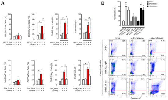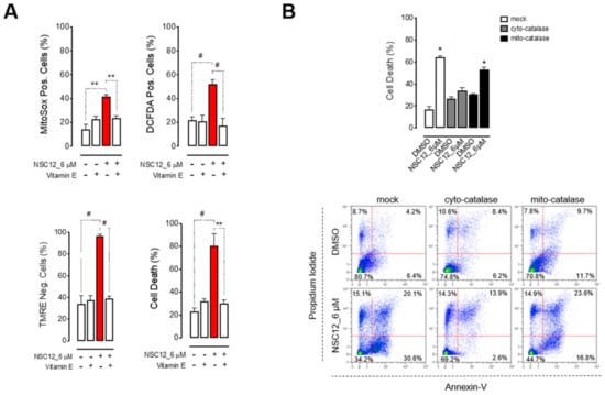 FGF trapping induces oxidative-stress-mediated apoptosis in FGF-dependent lung cancer cells. (A) H520 cells were treated with NSC12 in presence or absence of vitamin E (220 μM) for 48 h and cytofluorimetric analyses for mitochondrial or cytoplasmic ROS production, mitochondrial membrane depolarization and apoptosis by Mitosox, DCF-DA, TMRE and propidium iodide/Annexin-V stainings, respectively, were performed. (B) Upper panel: Percentage of mock and mitochondrial or cytoplasmic catalase-overexpressing H520 cell death (calculated as the sum of Annexin-V+/PI−, Annexin-V+/PI+, Annexin-V−/PI+) after treatment with NSC12 for 48 h. Lower panel: representative dot plots from citofluorimetric analysis. Data are mean ± SEM of 3 or more experimental replicates. * p < 0.05, ** p < 0.01, # p < 0.001.