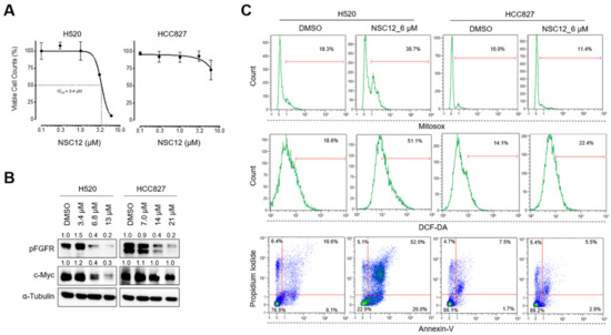 c-Myc downregulation and oxidative stress by FGF blockade is specific for FGF-dependent lung cancer cells. (A) H520 and HCC827 viable cell counts by flow cytometric analysis 48 h after treatment with increasing doses of NSC12. Data are mean ± SEM of 3 or more experimental replicates. (B) Western blot analysis of H520 and HCC827 cells after 3 h of treatment with increasing doses of NSC12. Densitometric quantification is reported above each band. (C) Cytofluorimetric analyses for mitochondrial or cytoplasmic ROS (reactive oxygen species) production and apoptosis by Mitosox, DCF-DA and propidium iodide/Annexin-V stainings, respectively.