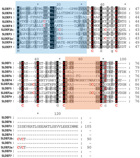 - Stotz, H.U.; Spence, B.; Wang, Y. A defensin from tomato with dual function in defense and development. Plant Mol. Biol. 2009, 71, 131–143. [Google Scholar] [CrossRef] [PubMed]