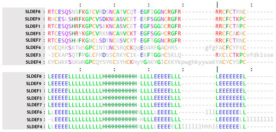 | 8 | SlDEF7 | NM_001310317/NP_001297246 | Solyc07g007710.4.1 | C-X10-C-X5-C-X3-C-X9-C-X6-C-X1-C-X3-C | 8.98 | 8 | 1–8, 2–5, 3–6, 4–7 | 0.954 |