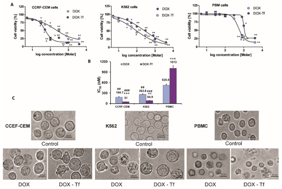 Cytotoxicity of free doxorubicin and doxorubicin–transferrin conjugate in human leukemia cell lines and peripheral blood mononuclear cells. (A): Viability of CCRF-CEM, K562, and PBMC cells after 48 h incubation with increasing concentrations of doxorubicin–transferrin (DOX–Tf) conjugate (violet symbols) or free doxorubicin (DOX) (blue symbols). Cell viability was measured by XTT assay. Values represent the means ± SD, (n = 5) * p < 0.05, ** p < 0.01 in comparison to untreated, control cells, (+) statistically significant differences noted between the probes incubated with free DOX compared to the conjugate, + p < 0.05. (B): Comparison of the cytotoxicity of free DOX and transferrin-bound DOX in CCRF-CEM and K562 cell lines or PBMCs. ## p < 0.05, ### p < 0.01 in comparison to normal, non-cancer cells, (++, +++) statistically significant differences noted between the probes incubated with free DOX compared to the conjugate, ++ p < 0.01, +++ p < 0.001. The values are the IC50 mean [nM] ± SD of five independent experiments with a 95% confidence interval. (C): Morphological changes observed with microscopy. Inverted phase contrast microscopy images were obtained following treatment of CCRF-CEM and K562 cells or PBMCs for 48 h with DOX–Tf or free DOX with the IC50 concentrations shown in the photos. Images were captured at 20× magnification, and the scale bars represent 20 µm.