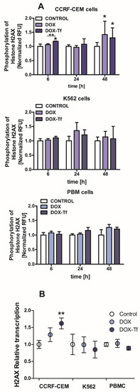 The reduction in cell viability triggered by the conjugate may be related to the various features of DOX–Tf toxicity, such as genotoxicity. Therefore, we measured the phosphorylation of histone H2AX, which is a molecular marker of dsDNA breaks. Our previous findings showed that Tf-bound DOX significantly induced DNA damage in both solid tumor and leukemia cell lines [24], demonstrating that the conjugate caused DNA lesions and the formation of alkali-labile sites. Here, we aimed to determine whether DOX–Tf triggered dsDNA breaks in two malignant cell lines, versus noncancerous PBMCs. As shown in Figure 2A, we found a significant increase in phosphorylation of histone H2A, predominantly in CCRF-CEM cells after 6 and 48 h of drug treatment. Under the same conditions, we observed a predominant role of the conjugate that induced 1.2- and 1.4-fold increases in intracellular ɣH2AX levels. In contrast, 1.3-fold growth was elicited by free DOX in K562 cells after a 24 h incubation. Furthermore, mostly in the CCRF-CEM cell line, DOX–Tf conjugate treatment led to an increase in histone H2AX transcription as the first cellular response to DNA lesions (Figure 2B).